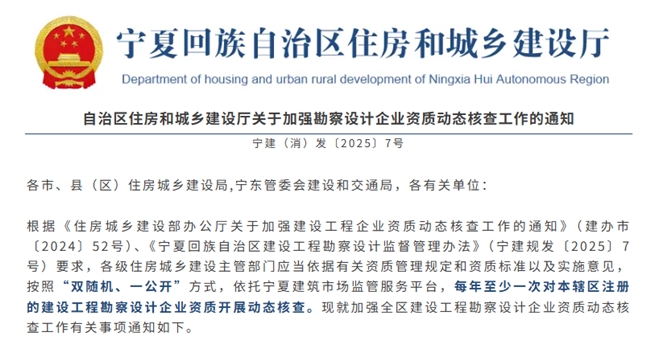 近日,宁夏回族自治区住房和城乡建设厅发布《关于加强勘察设计企业资质动态核查工作的通知》,明确将按照 “双随机、一公开” 方式,依托宁夏建筑市场监管服务平台,每年至少一次对辖区内建设工程勘察设计企业资质开展动态核查。对此,建管家提醒相关企业要注意通知内容,做好积极应对。