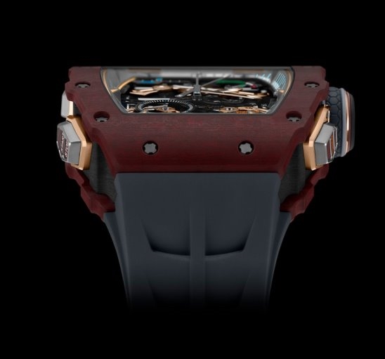 在材质与外观设计上,RM 41-01延续品牌标志性的酒桶形表壳,由105枚零件组成,尺寸为43.23mm×49.65mm,厚度16.08mm,曲面设计贴合手腕,兼顾佩戴舒适度与腕间存在感。腕表推出两款设计版本,均限量30枚,其中一款采用RICHARD MILLE与North ThinPly Technology(NTPT?)联合研发的全新胭脂红Basalt TPT玄武岩纤维材质,这是该材质首次应用于品牌腕表,40微米厚的玄武岩纤维以45°角交错堆叠,呈现出近似天然木纹的独特纹理,兼具卓越机械性能、耐化学腐蚀性、热稳定性及抗紫外线特性;另一款则采用深蓝色Quartz TPT石英纤维材质,两款版本的中层表壳均使用Carbon TPT碳纤维材质,进一步提升腕表的耐用性。
